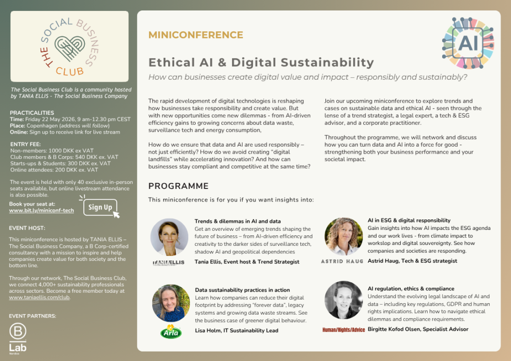 - Trends & cases of AI and sustainability in business (Tania Ellis, Trend Strategist, The Social Business Company)